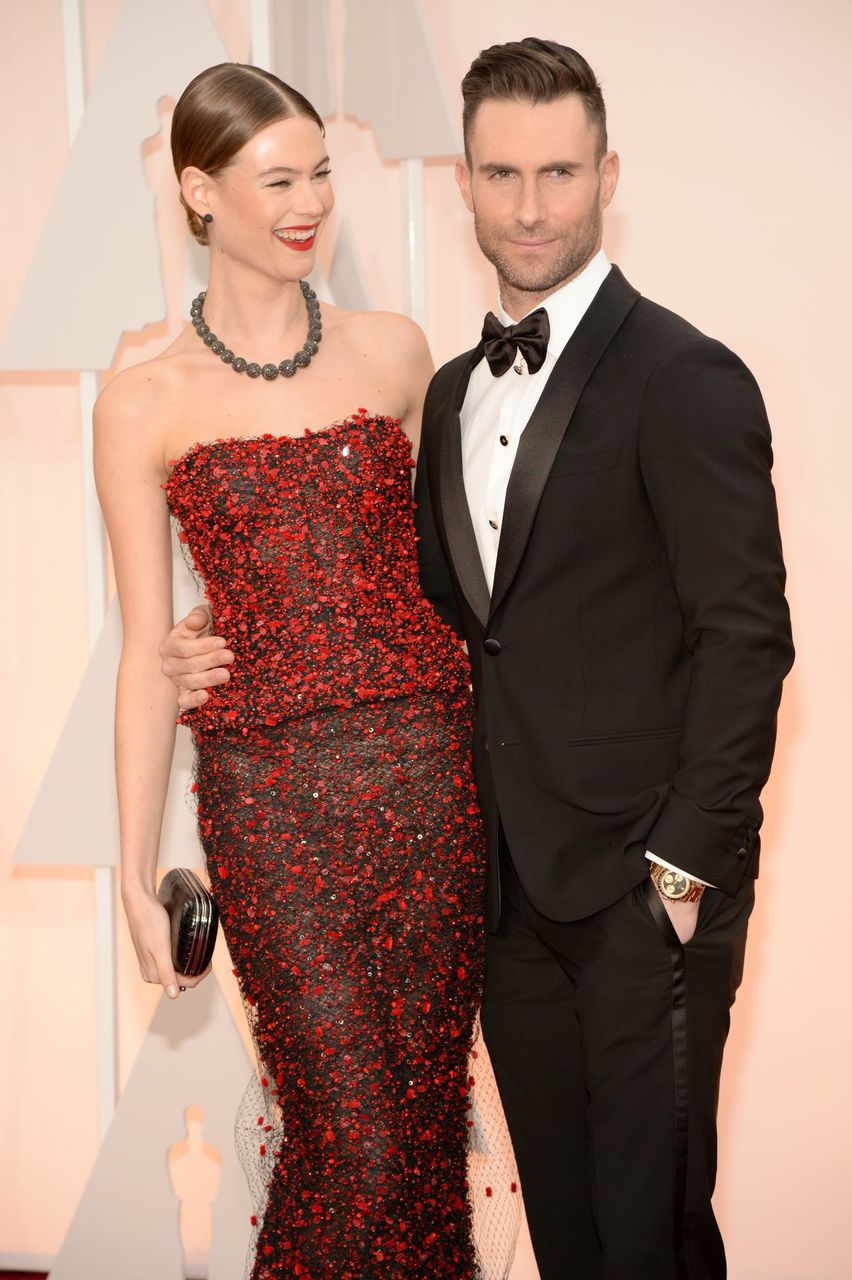Lors de la 87ème cérémonie des Oscars, le 22 février passé, le torride Ange namibien de Victoria’s Secret, chignon serré et bouche carmin, a arboré un collier “BOULE » en or blanc serti de diamants. Les bijoux ont illuminé son magnifique cou dénudé. Point d’orgue de sa tenue, une bague haute joaillerie d’un diamant taille émeraude, mis en valeur dans un écrin de diamants noirs. Enserrée dans un corset pailleté, la belle était accompagnée de son mari, la rock star Adam Levine, qui a interprété la chanson nominée aux Oscars « Lost Stars ».