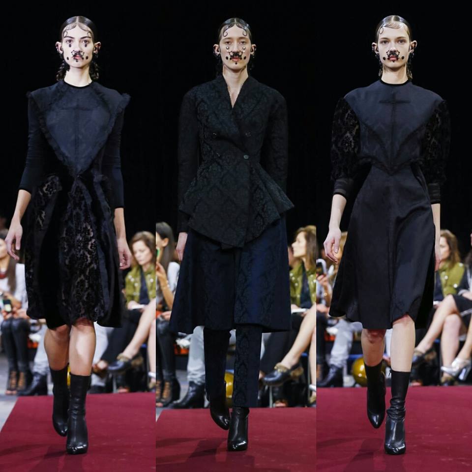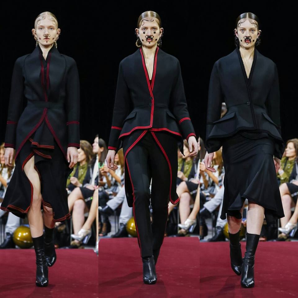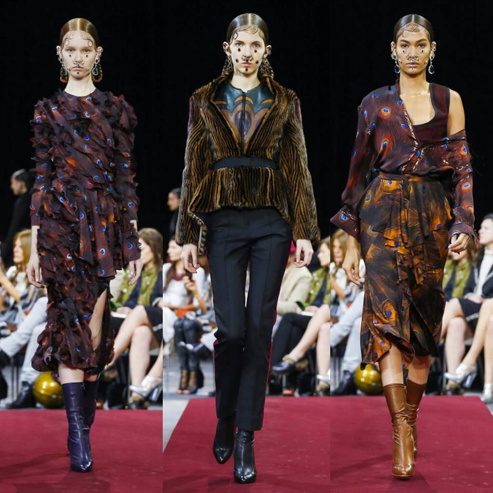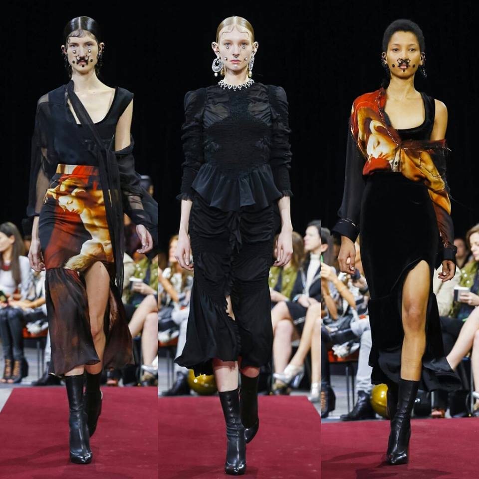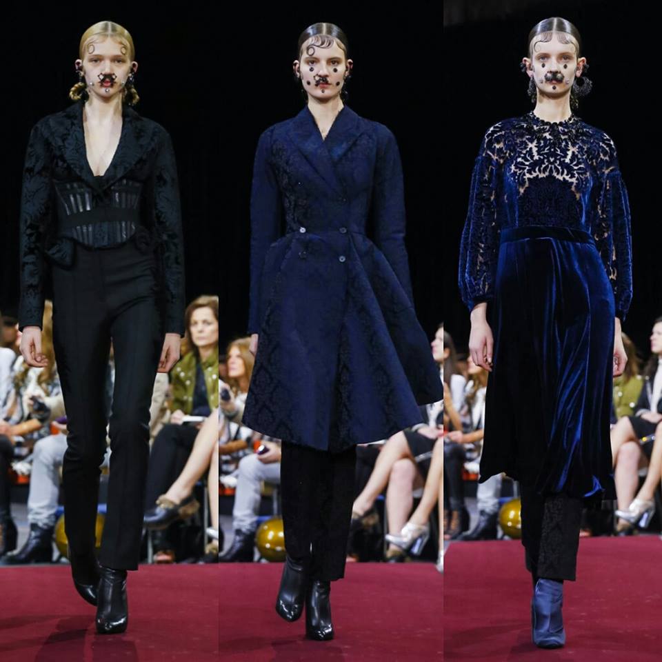 Dimanche, #PFW: Riccardo Tisci fond le streetwear, le charisme espagnol, les piercings, les seventies et les fourrures dans une même collection. Le bleu nuit se complète d’un velours pourpre. Les vestes péplum tranchent sur des leggings cavalier, quand  la soie ajourée s’immisce dans le losange des plastrons. Une future it-collection!
