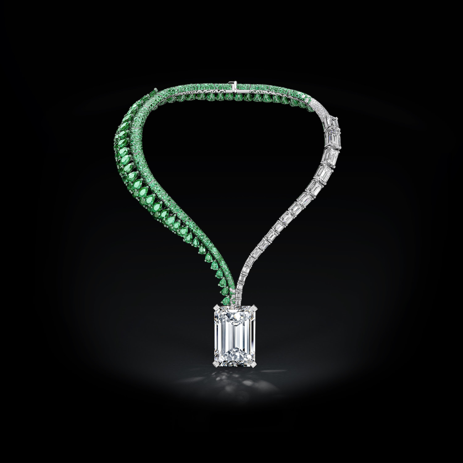 This amazing diamond is part of a one-of-a-kind creation by Swiss jewellery house de GRISOGONO, a necklace featuring another 18 emerald-cut diamonds and two rows of 66 pear-shaped emeralds. The diamond was cut from a 404-carat rough diamond (4 de Fevereiro), discovered in early February 2016 in Angola. The rough is the 27th biggest rough white diamond ever discovered and the largest in Angola. The rough was analyzed in Antwerp and cut in New York, where a team of 10 diamond-cutting specialists were involved in mapping, plotting, cleaving, cutting and polishing the rough 404.20 carat into a unique 163.41 carat emerald-cut stone. The first cut was done on 29th of June 2016, when the 80-year-old master diamond cleaver performed a cut along a grain line to cleave the crystal in two. After 11 months of work, the polished 163.41-carat stone was ready to be sent to the GIA in late December 2016.